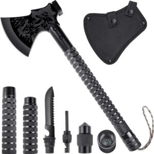 Survival Axt 10 in 1, Spaltaxt für Holz, Schärfe Camping Beil, Multitool mit Outdoor Messer und Kompass, Handbeil mit Geschenkbox Schwarze Set für Waldreisen, Jagd, Garten